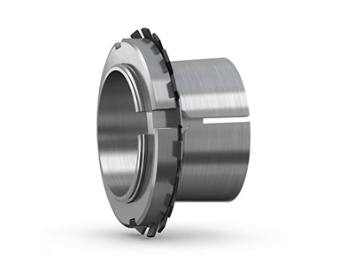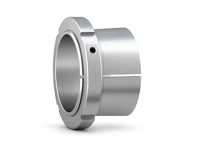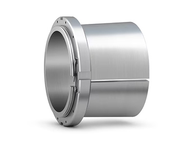紧定套是常用部件,可将圆锥孔轴承固定在圆柱形轴颈上,可以用在光轴或阶梯轴上。这种附件便于安装,无需在轴上增加位置。在光轴上使用时,轴承可以固定在轴上的多个位置。在阶梯轴上使用紧定套时,与 L 形隔环配合使用,可以将轴承较好地轴向定位,因此便于轴承的安装和拆卸。